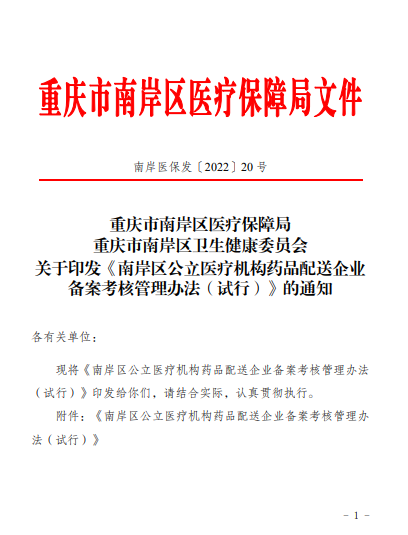【重庆】关于印发《南岸区公立医疗机构药品配送企业备案考核管理办法(试行)》的通知