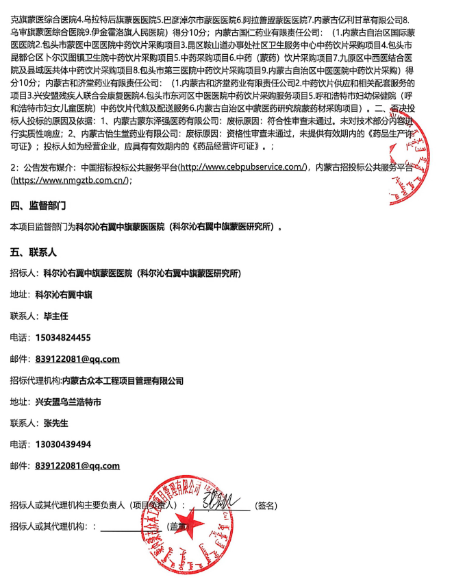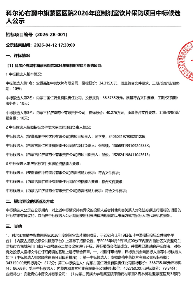 【兴安盟市科尔沁右翼中旗蒙医医院】内蒙古自治区兴安盟市科尔沁右翼中旗蒙医医院2026年度制剂室饮片采购项目中标候选人公示