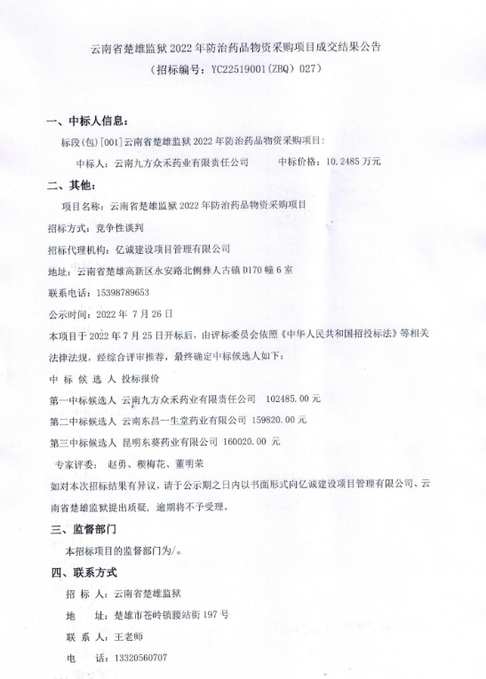 【楚雄监狱】云南省楚雄监狱2022年防治药品物资采购成交结果公告