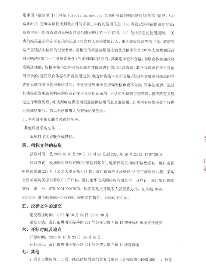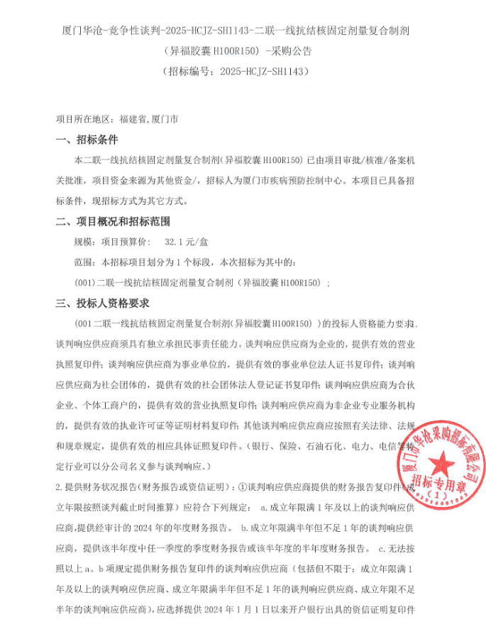 【厦门市疾病预防控制中心】福建省厦门华沧-竞争性谈判-2025-HCJZ-SH1143-二联一线抗结核固定剂量复合制剂(异福胶囊H100R150) -采购公告