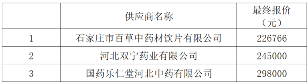 四、参与报价供应商:国药乐仁堂河北中药有限公司、河北双宁药业有限公司、石家庄市百草中药材饮片有限公司