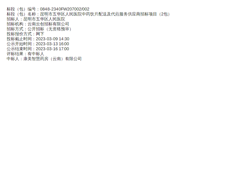 【昆明市五华区人民医院】云南省昆明市五华区人民医院中药饮片配送及代煎服务供应商招标项目(2包)中标结果公告