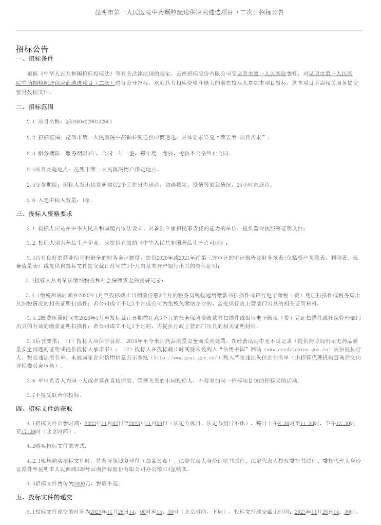 【昆明市第一人民医院】云南省昆明市第一人民医院中药颗粒配送供应商遴选项目(二次)招标公告