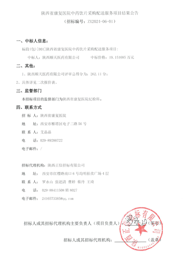 【陕西省康复医院】陕西省康复医院中药饮片采购配送服务项目结果公告