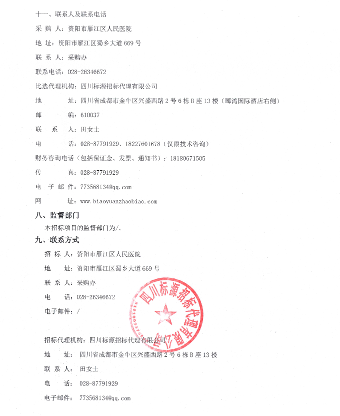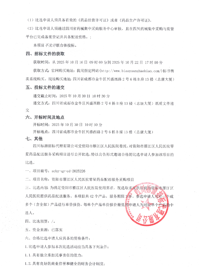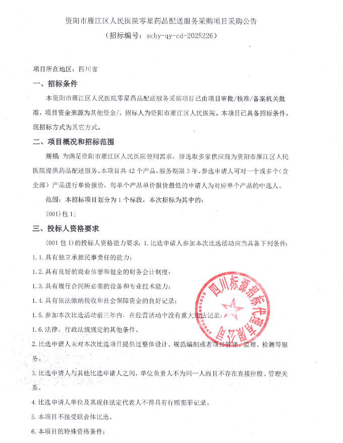 【资阳市雁江区人民医院】四川省资阳市雁江区人民医院零星药品配送服务采购项目采购公告