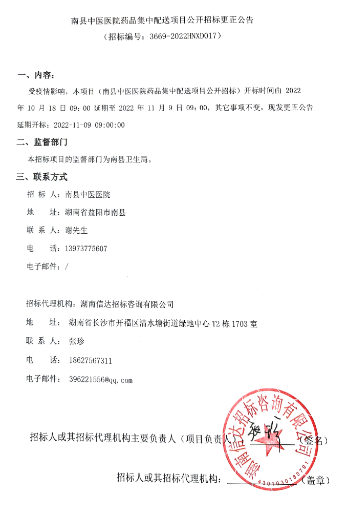 【湖南省益阳市南县中医医院】药品集中配送项目公开招标更正公告
