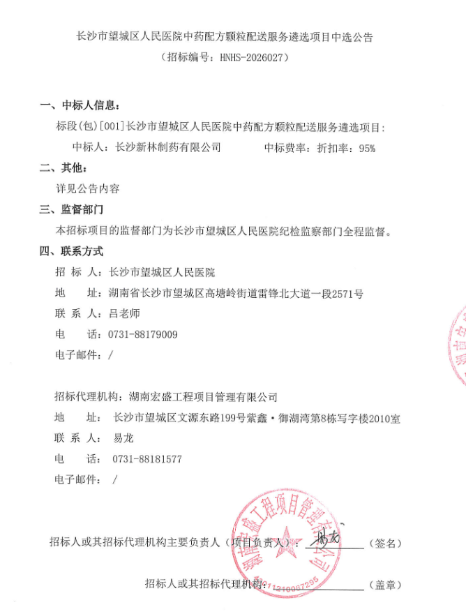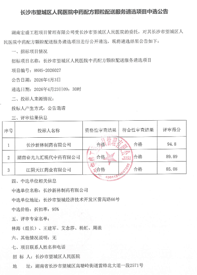 【长沙市望城区人民医院】湖南省长沙市望城区人民医院中药配方颗粒配送服务遴选项目中选公告