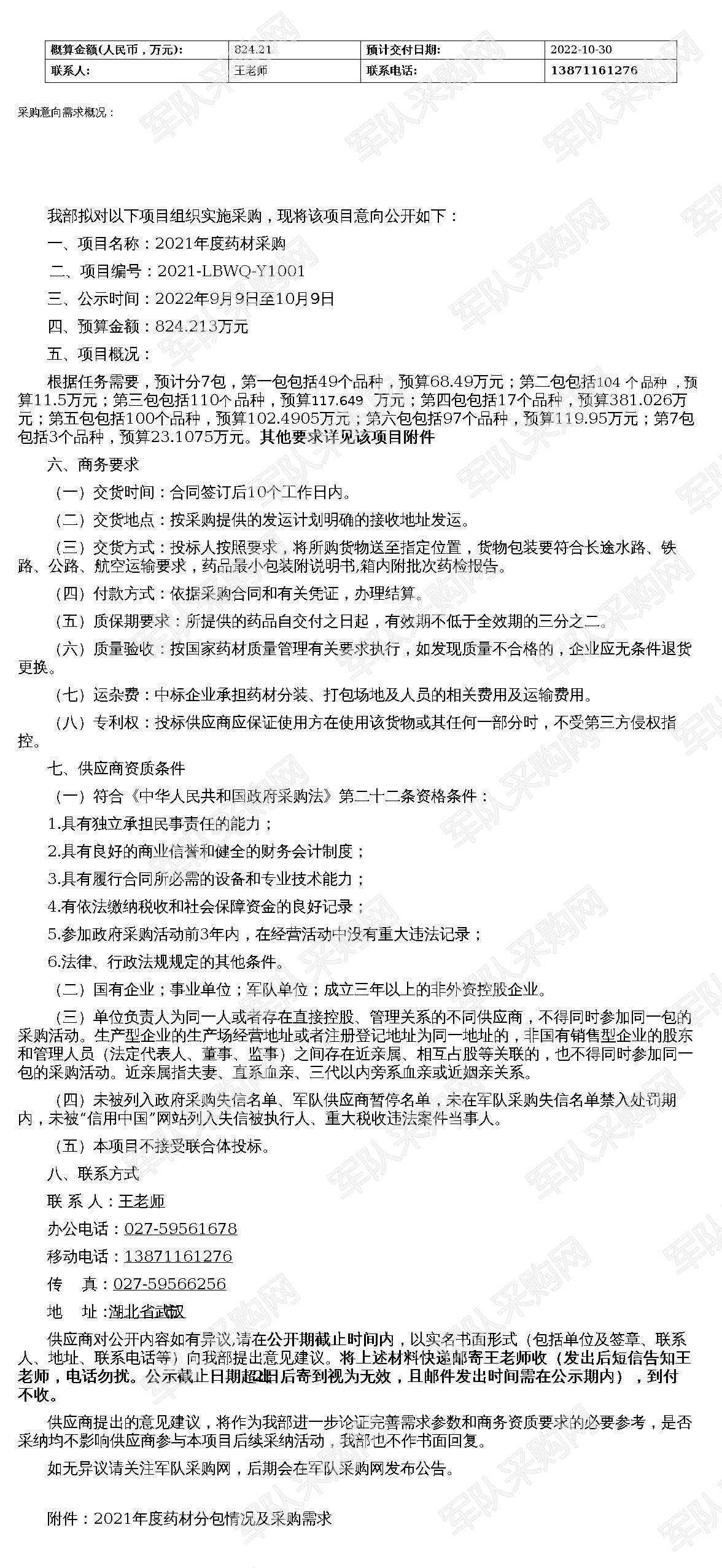 【军队采购网】2021年度药材采购(2021-LBWQ-Y1001)意向公开