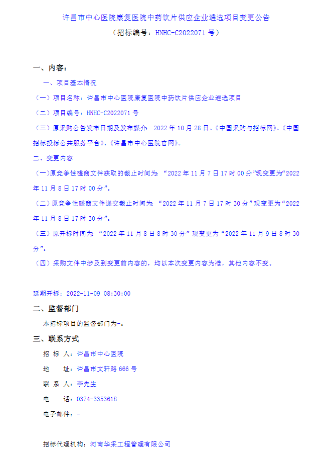 【许昌市中心医院】河南省许昌市中心医院康复医院中药饮片供应企业遴选项目变更公告