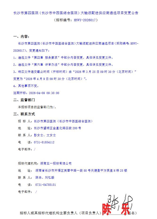 【长沙市第四医院】湖南省长沙市第四医院(长沙市中西医结合医院)大输液配送供应商遴选项目变更公告