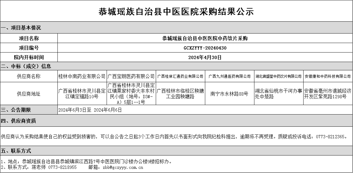 【桂林市恭城瑶族自治县中医医院】广西壮族自治区桂林市恭城瑶族自治县中医医院中药饮片采购招标结果公示