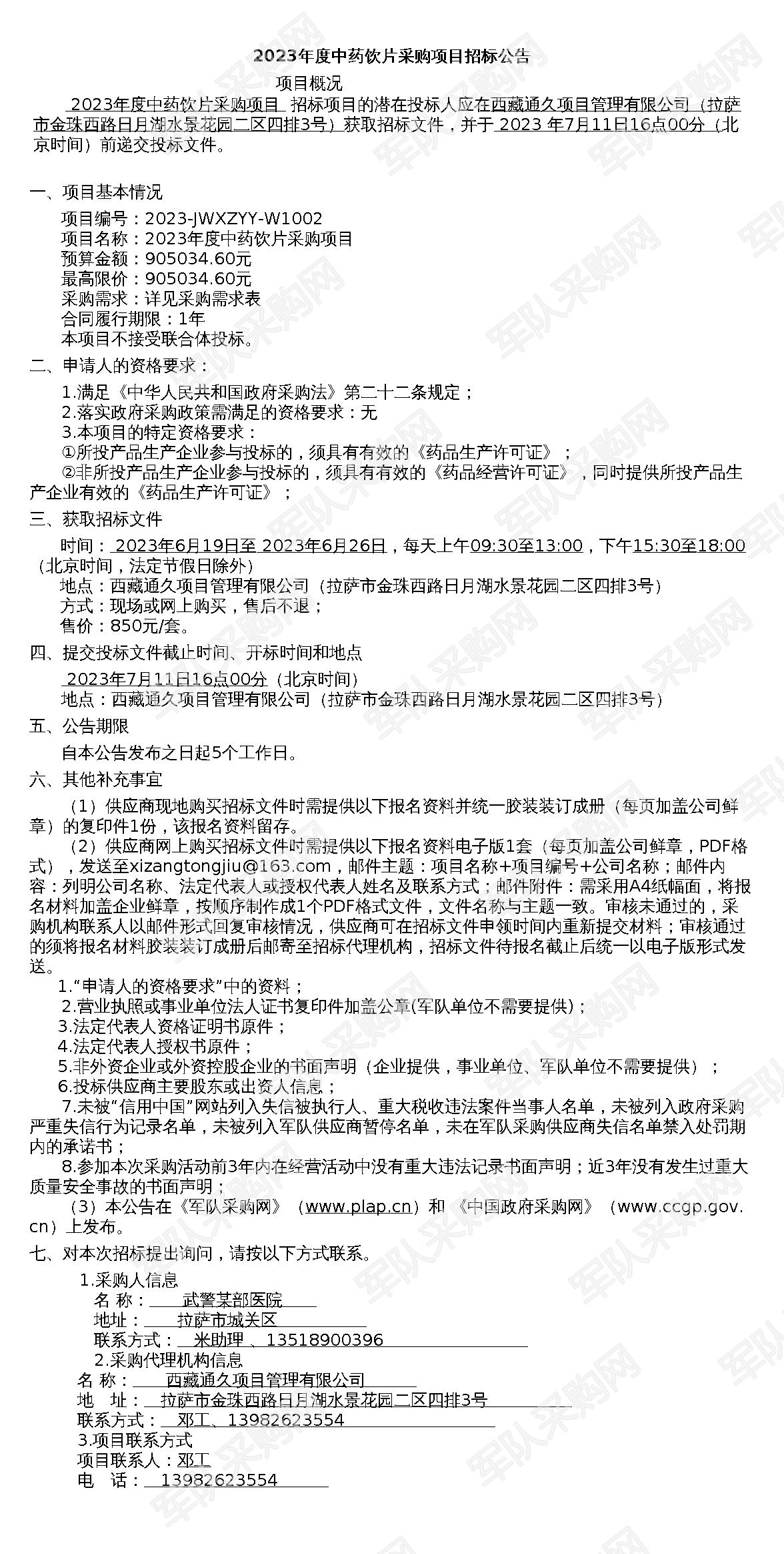【军队采购】军队采购网2023年度中药饮片采购项目招标公告(2023-JWXZYY-W1002)