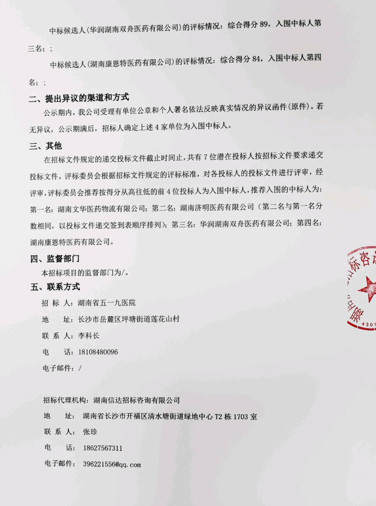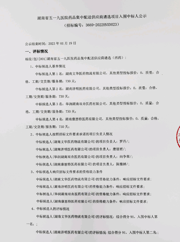 【湖南省五一九医院】湖南省五一九医院药品集中配送供应商遴选项目入围中标人公示