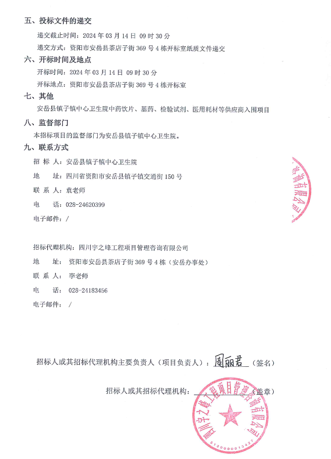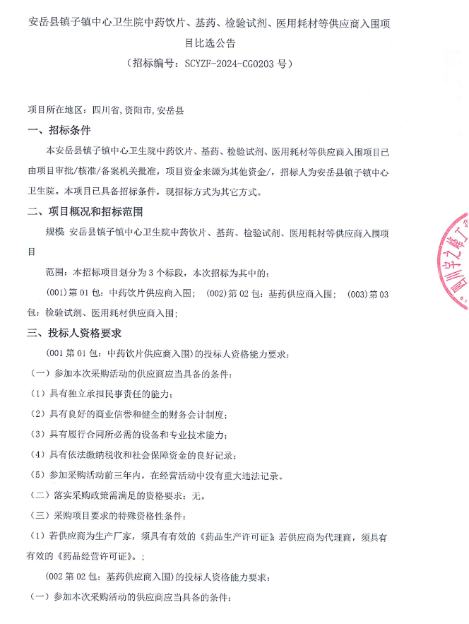 【资阳市安岳县镇子镇中心卫生院】四川省资阳市安岳县镇子镇中心卫生院中药饮片、基药、检验试剂、医用耗材等供应商入围项目比选公告