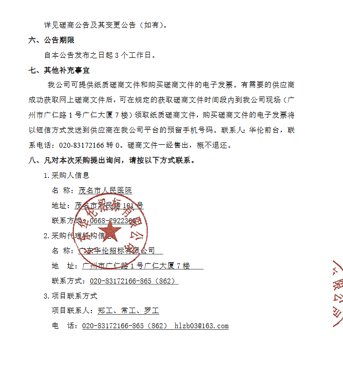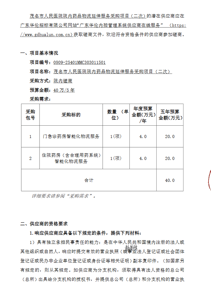 【茂名市人民医院】广东省茂名市人民医院院内药品物流延伸服务采购项目(二次)(0809-25401MMC303011501)院内磋商公告