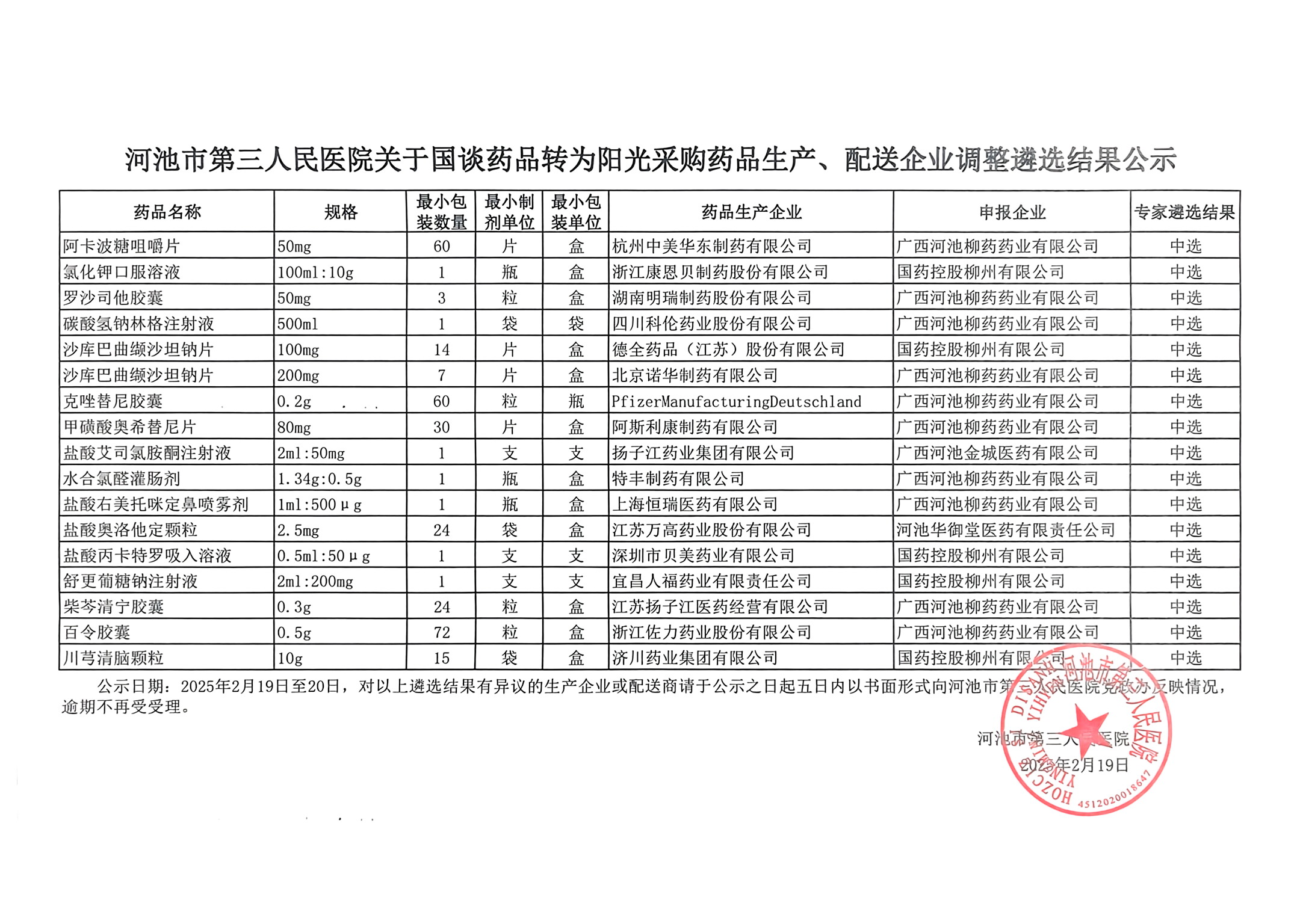 【河池市第三人民医院】广西壮族自治区河池市第三人民医院关于国谈药品转为阳光采购药品生产、配送企业调整的公告(20250218)