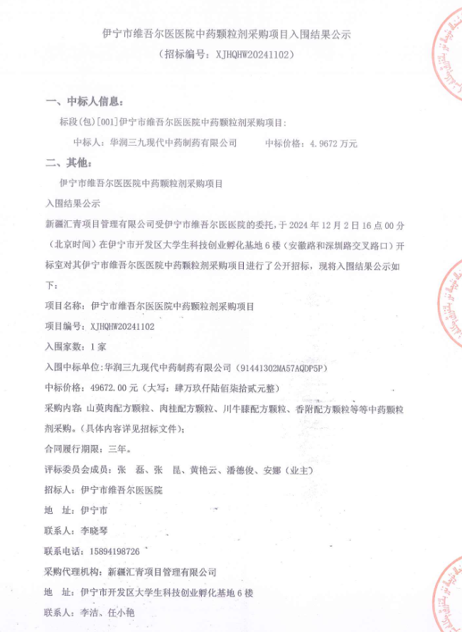 【伊宁市维吾尔医医院】新疆维吾尔自治区伊犁哈萨克自治州伊宁市维吾尔医医院中药颗粒剂采购项目入围结果公示