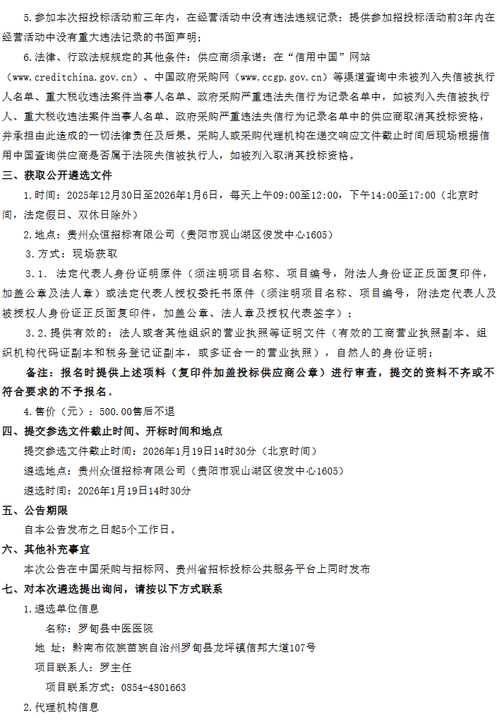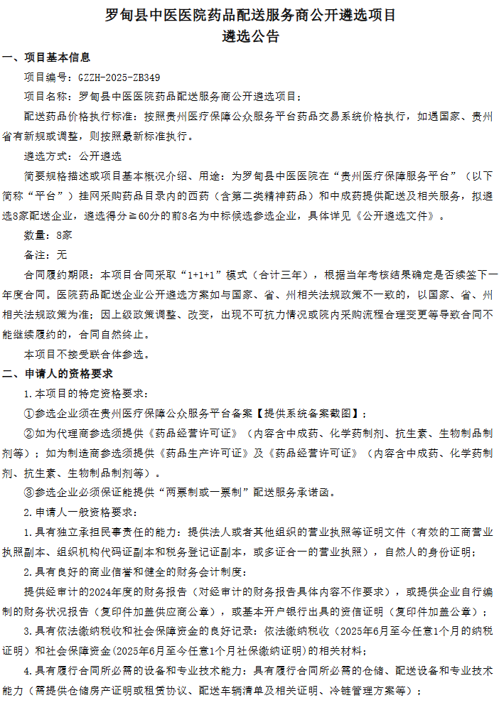 【黔南布依族苗族自治州罗甸县中医医院】贵州省黔南布依族苗族自治州罗甸县中医医院药品配送服务商公开遴选项目遴选公告