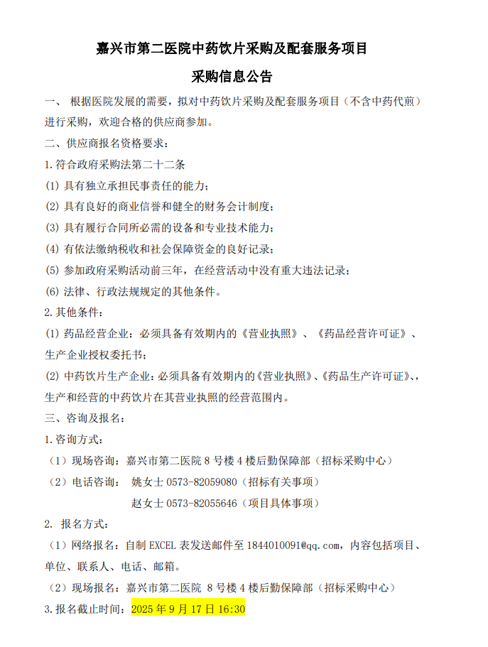 【嘉兴市第二医院】浙江省嘉兴市第二医院中药饮片采购及配套服务项目采购信息