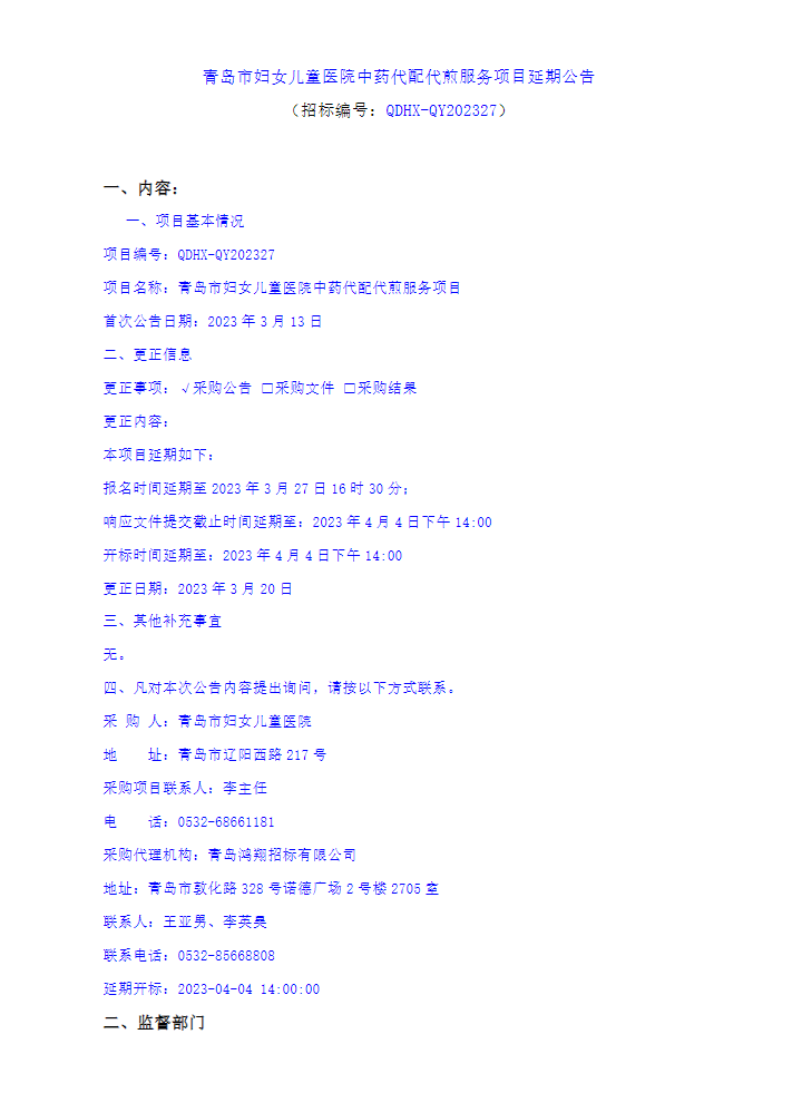 【青岛市妇女儿童医院】山东省青岛市妇女儿童医院中药代配代煎服务项目延期公告