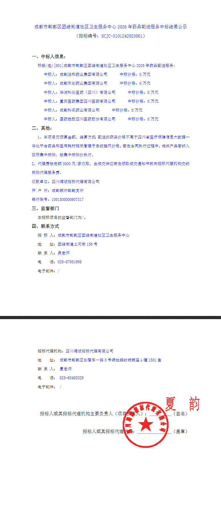 【成都市郫都区团结街道社区卫生服务中心】四川省成都市郫都区团结街道社区卫生服务中心2026年药品配送服务中标结果公示