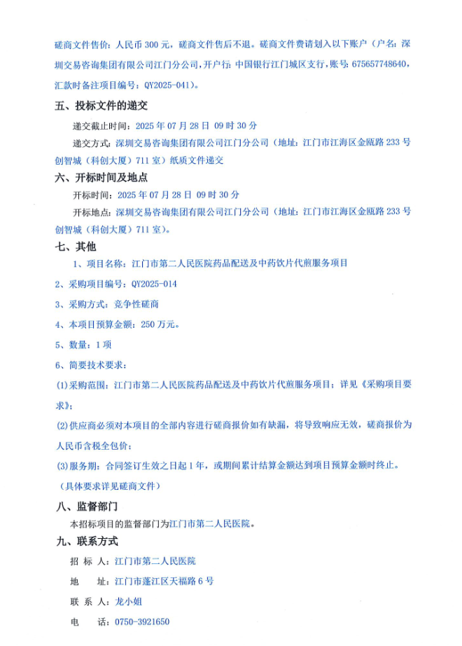 【江门市第二人民医院】广东省江门市第二人民医院药品配送及中药饮片代煎服务项目采购公告