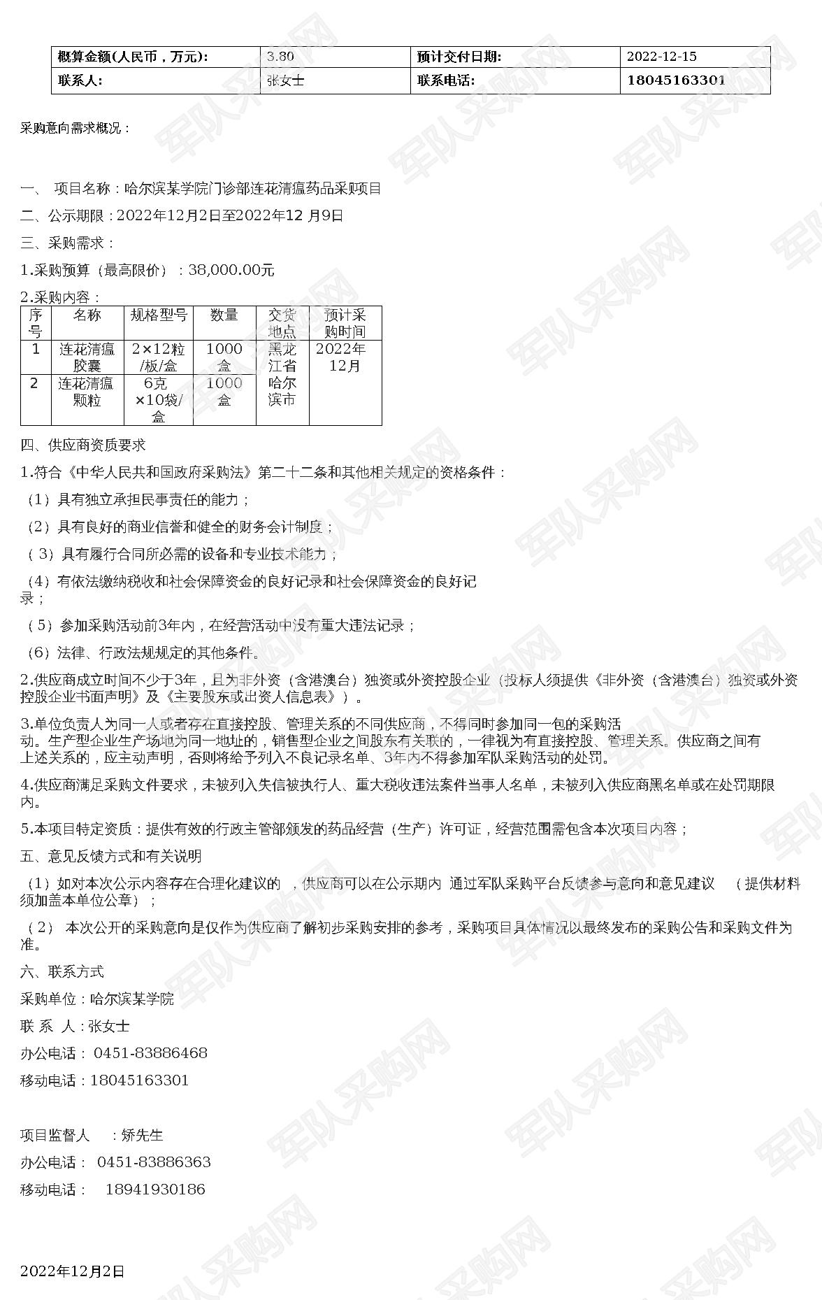 【军队采购】军队采购网哈尔滨某学院门诊部连花清瘟药品采购意向