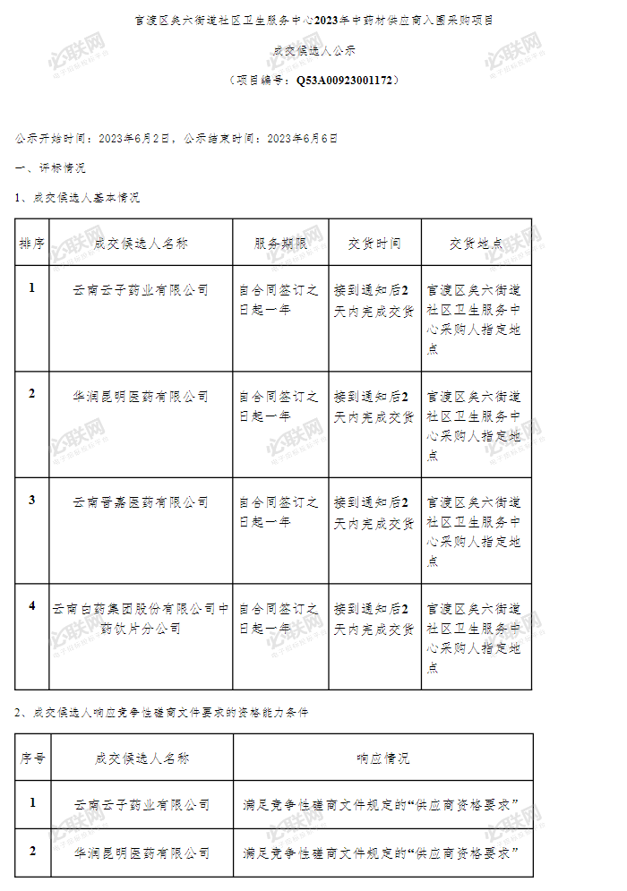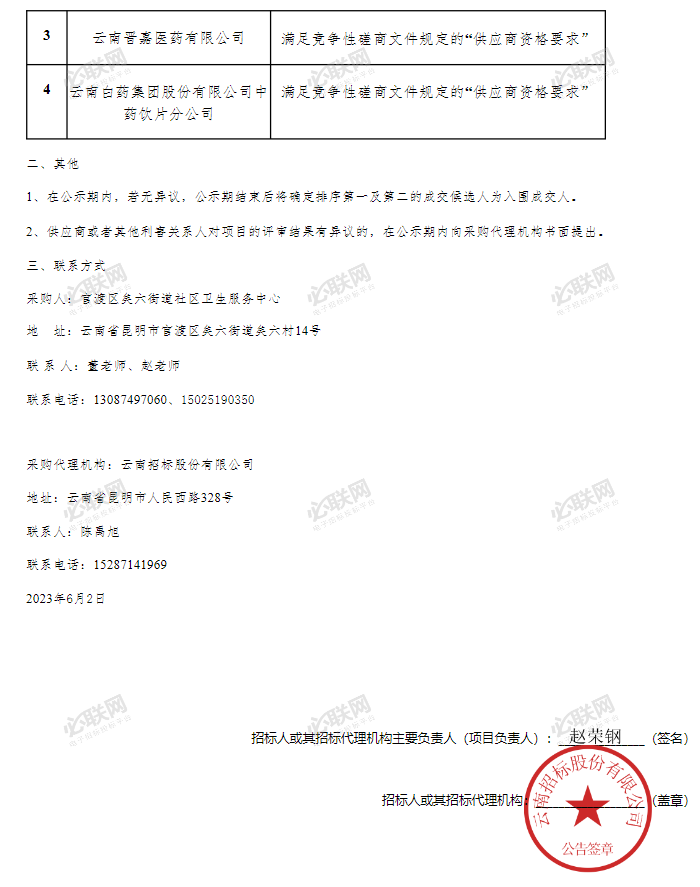 【昆明市官渡区矣六街道社区卫生服务中心】云南省昆明市官渡区矣六街道社区卫生服务中心2023年中药材供应商入围采购项目竞争性磋商评标公示