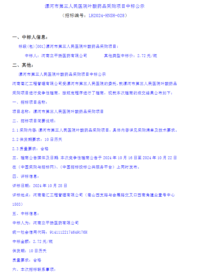 【漯河市第三人民医院】河南省漯河市第三人民医院叶酸药品采购项目中标公示