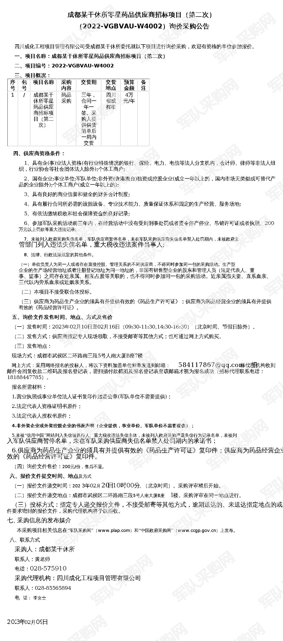 【成都某干休所】军队采购网成都某干休所零星药品供应商招标项目(第二次)询价采购公告(2022-VGBVAU-W4002)