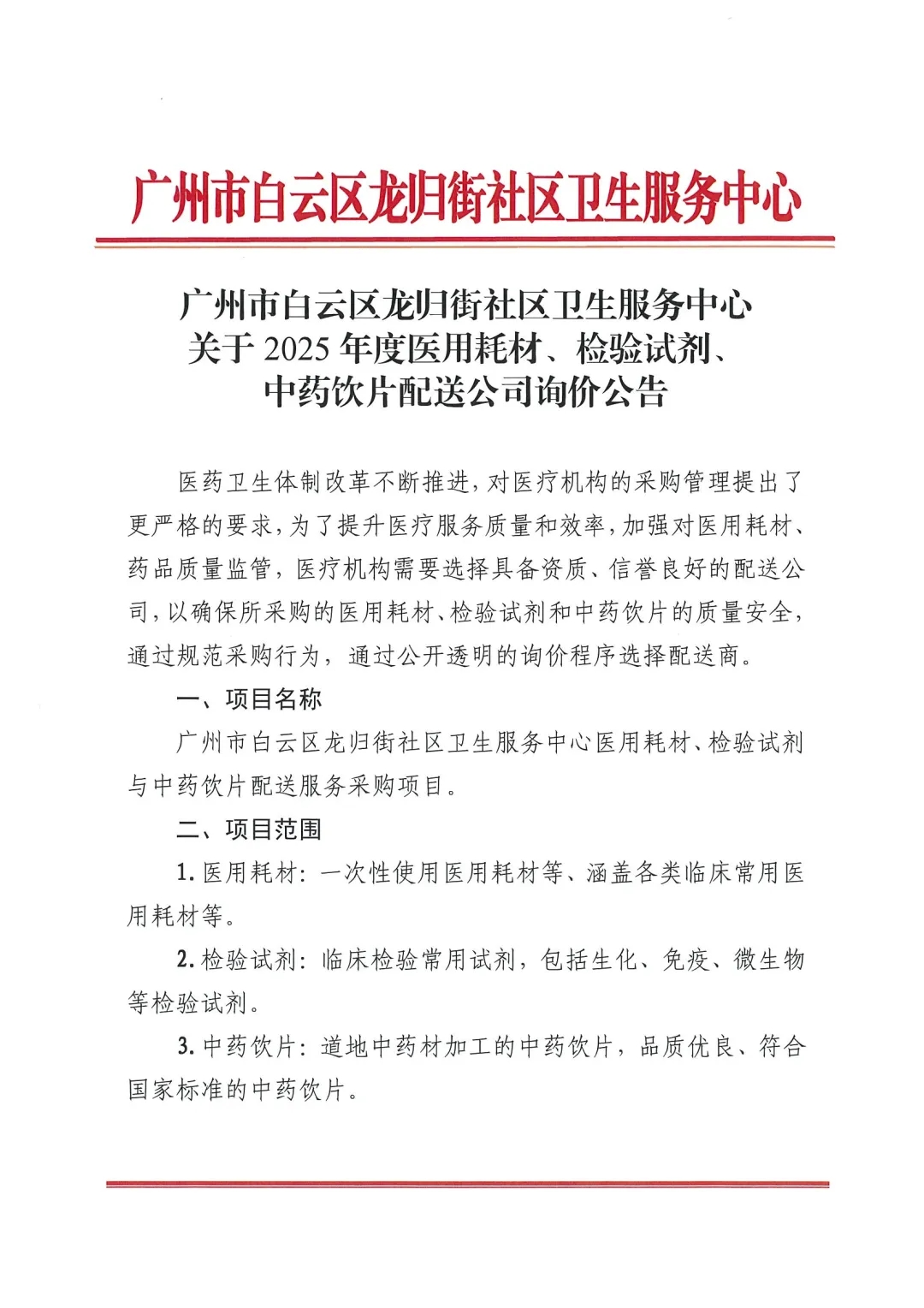 广州市白云区龙归街社区卫生服务中心拟通过询价的方式选定白云区龙归街社区卫生服务中心2025年度医用耗材、检验试剂、中药饮片配送公司,现诚邀符合条件的公司参与报价。