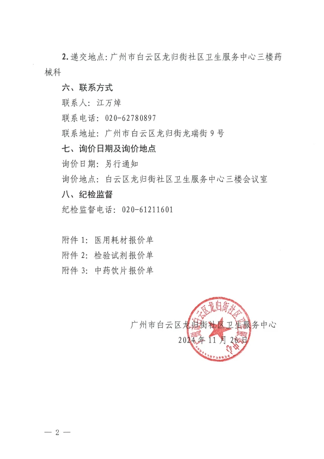 询价地点:白云区龙归街社区卫生服务中心三楼会议室