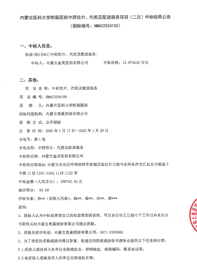 【内蒙古医科大学附属医院】内蒙古医科大学附属医院中药饮片、代煎及配送服务项目(二次)中标结果公告