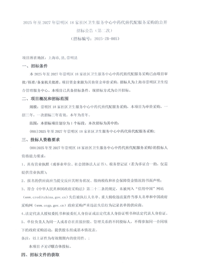 【上海市崇明区卫生综合管理服务中心】上海市2025年至2027年崇明区18家社区卫生服务中心中药代煎代配服务采购的公开招标公告(第二次)