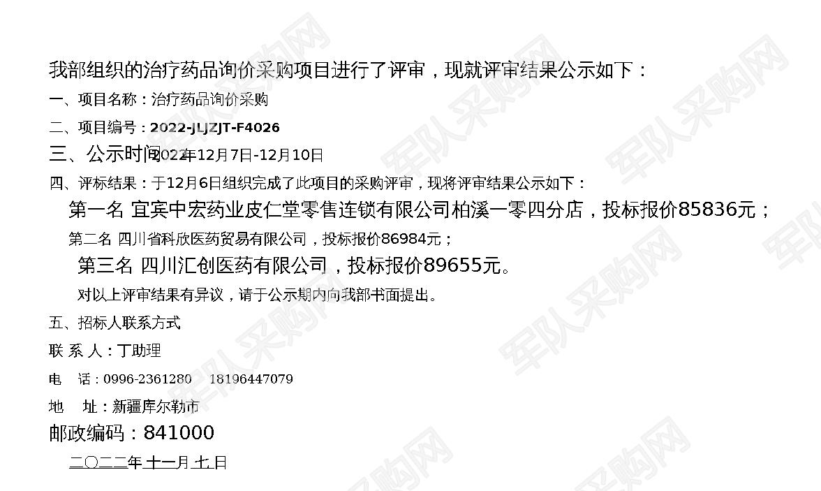 【军队采购】军队采购网治疗药品询价采购中标结果公示(2022-JLJZJT-F4026)