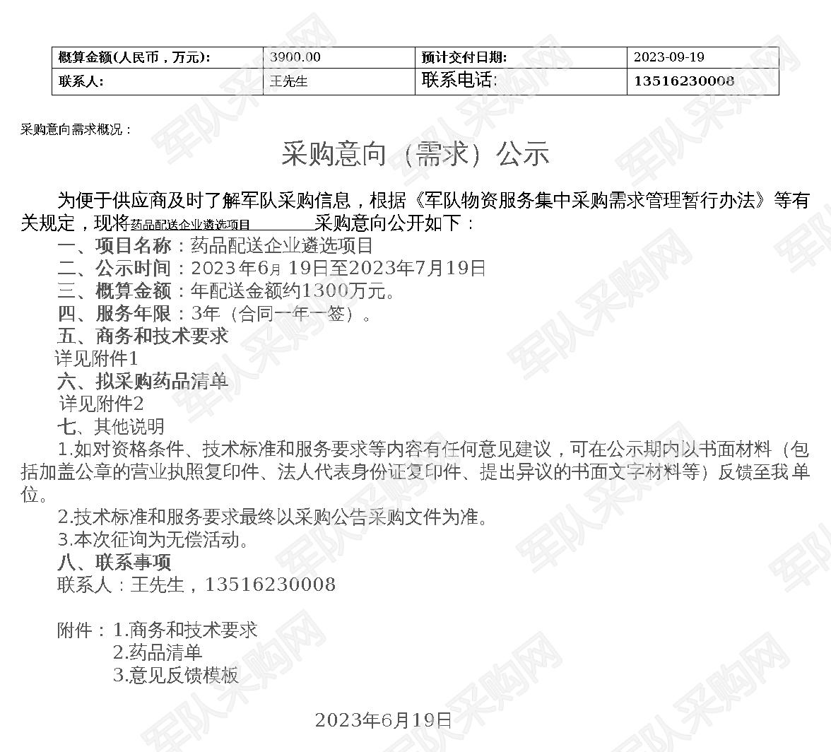 【军队采购】军队采购网药品配送企业遴选项目采购意向公开(2023-JWTJJW-F1001)