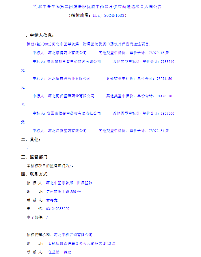 【河北中医学院第二附属医院】河北中医学院第二附属医院优质中药饮片供应商遴选项目入围公告