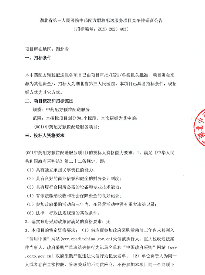 【湖北省第三人民医院】湖北省第三人民医院中药配方颗粒配送服务项目竞争性磋商公告