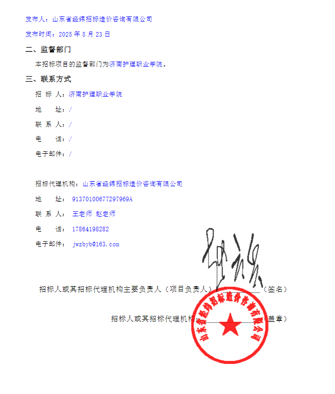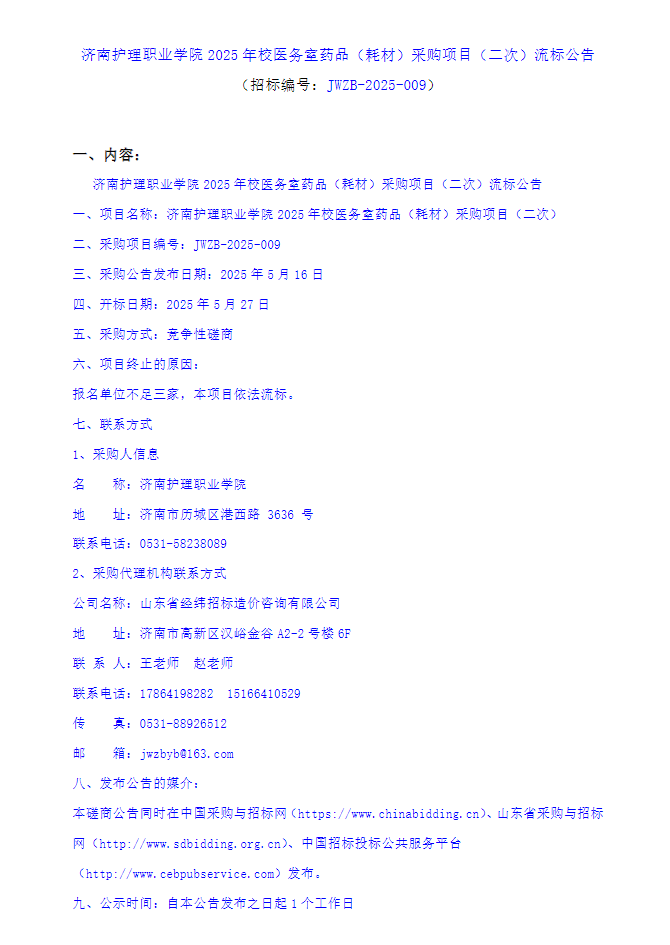 【济南护理职业学院】山东省济南护理职业学院2025年校医务室药品(耗材)采购项目(二次)流标公告