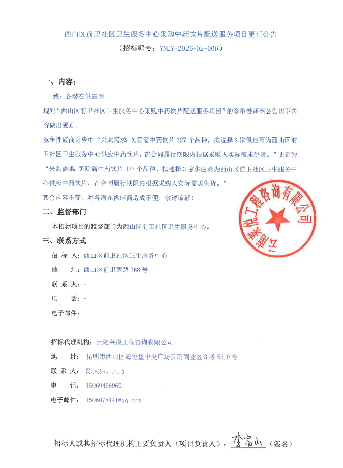 【昆明市西山区前卫社区卫生服务中心】云南省昆明市西山区前卫社区卫生服务中心采购中药饮片配送服务项目更正公告