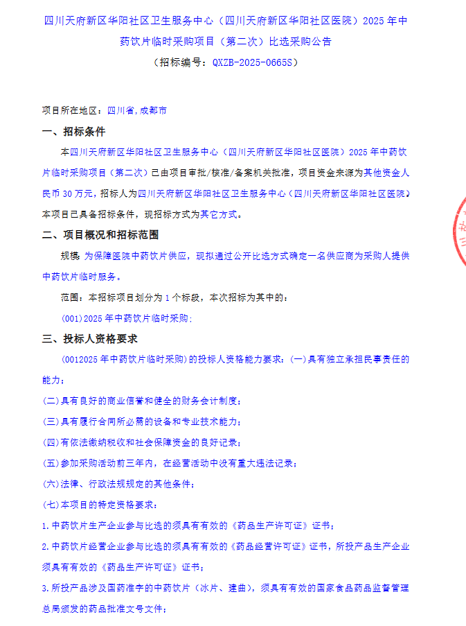 【四川天府新区华阳社区卫生服务中心】四川天府新区华阳社区卫生服务中心(四川天府新区华阳社区医院)2025年中药饮片临时采购项目(第二次)比选采购公告