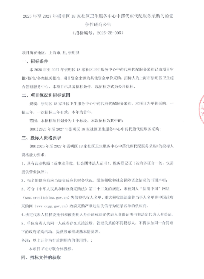 【上海市崇明区卫生综合管理服务中心】上海市2025年至2027年崇明区18家社区卫生服务中心中药代煎代配服务采购的的竞争性磋商公告
