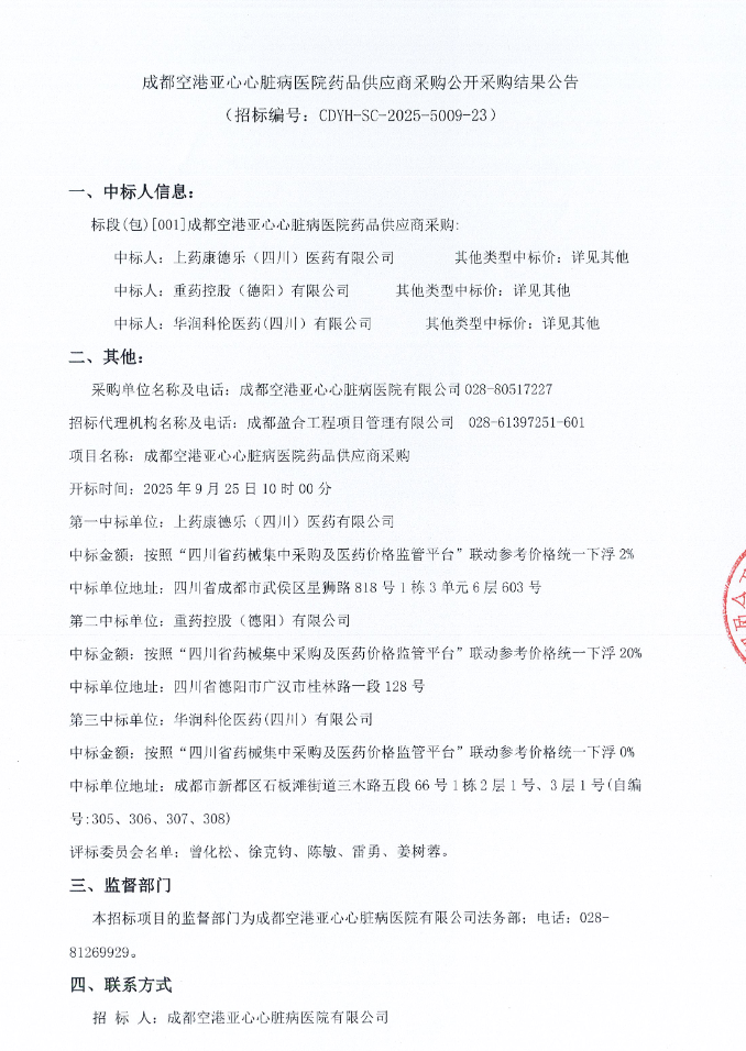 【成都空港亚心心脏病医院】四川省成都空港亚心心脏病医院药品供应商采购公开采购结果公告