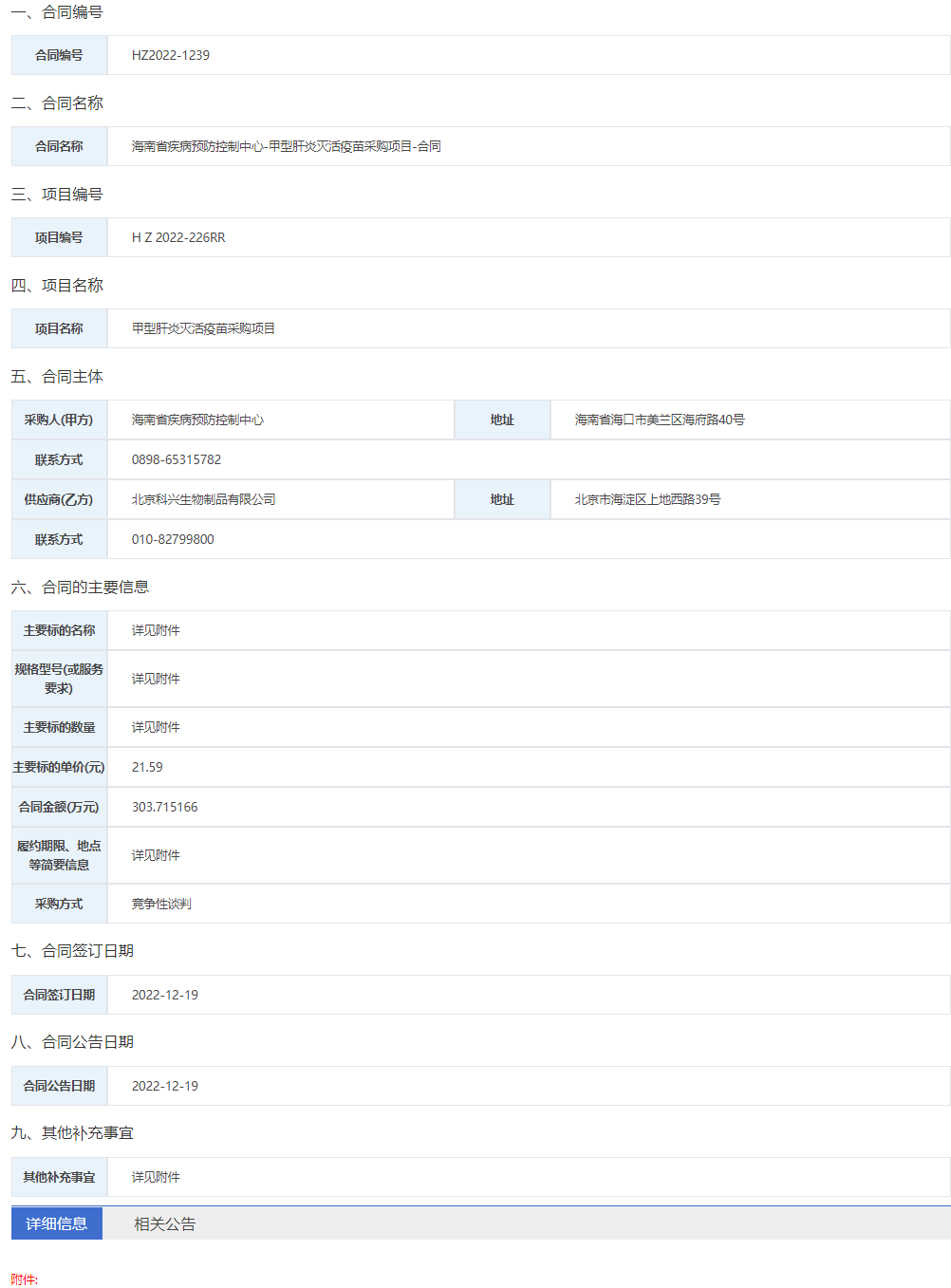 【海南省疾病预防控制中心】海南省疾病预防控制中心-甲型肝炎灭活疫苗采购项目-合同公告