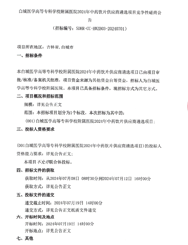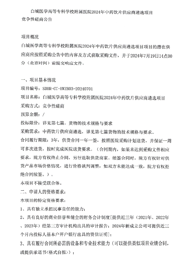 【吉林省白城医学高等专科学校附属医院】吉林省白城医学高等专科学校附属医院2024年中药饮片供应商遴选项目竞争性磋商公告