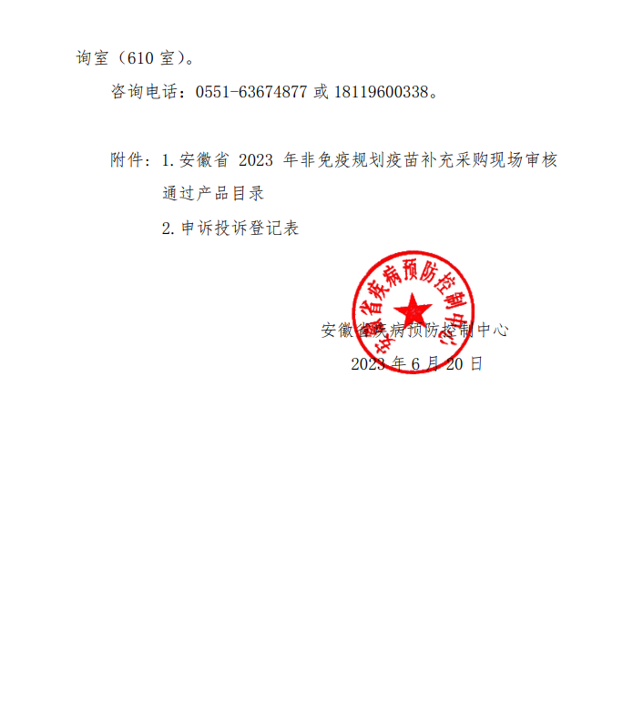 根据《关于印发安徽省非免疫规划疫苗集中采购方案的通知》(皖卫疾控发[2021]2号)及《安徽省2023年非免疫规划疫苗补充采购公告》相关要求,2023年6月16日,专家对企业递交的申报材料开展了现场审核工作。现将审核通过产品(详见附件1)予以公示,公示期为5个工作日。