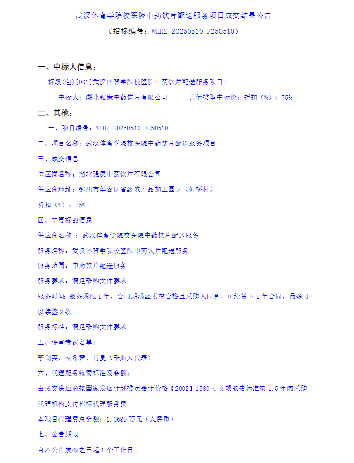 【武汉体育学院校医院】湖北省武汉体育学院校医院中药饮片配送服务项目成交结果公告