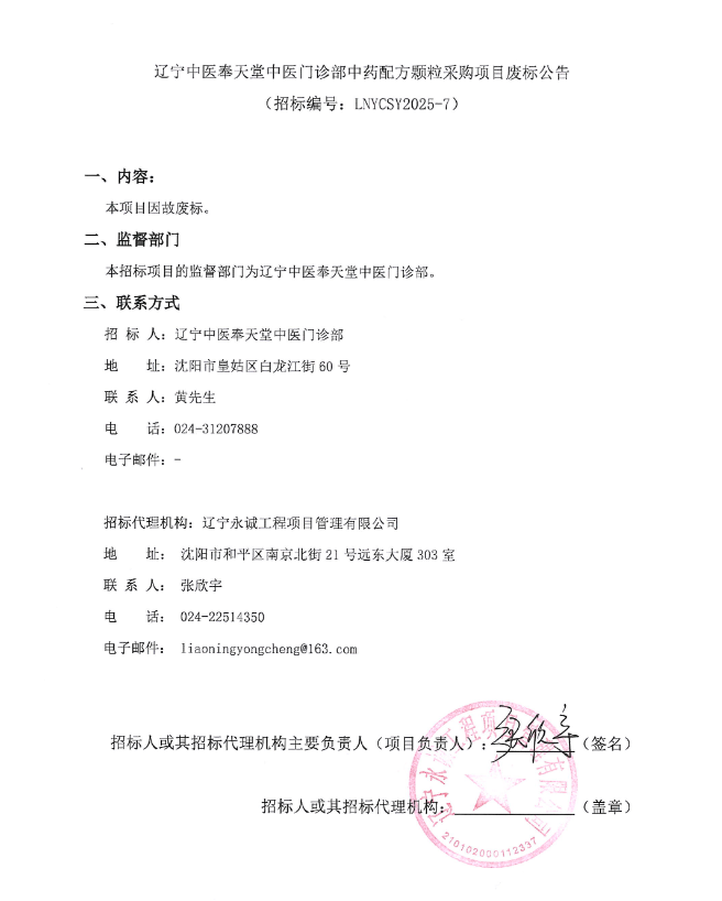 【辽宁中医奉天堂中医门诊部】辽宁中医奉天堂中医门诊部中药配方颗粒采购项目废标公告(20250124)