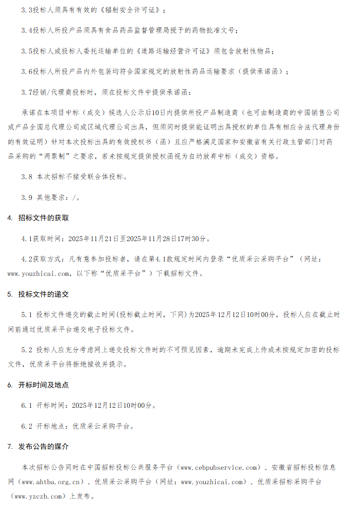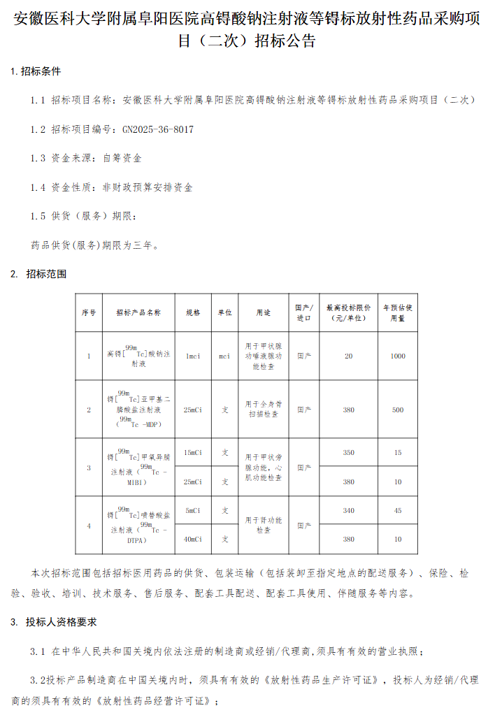 【安徽医科大学附属阜阳医院】安徽医科大学附属阜阳医院高锝酸钠注射液等锝标放射性药品采购项目(二次)招标公告