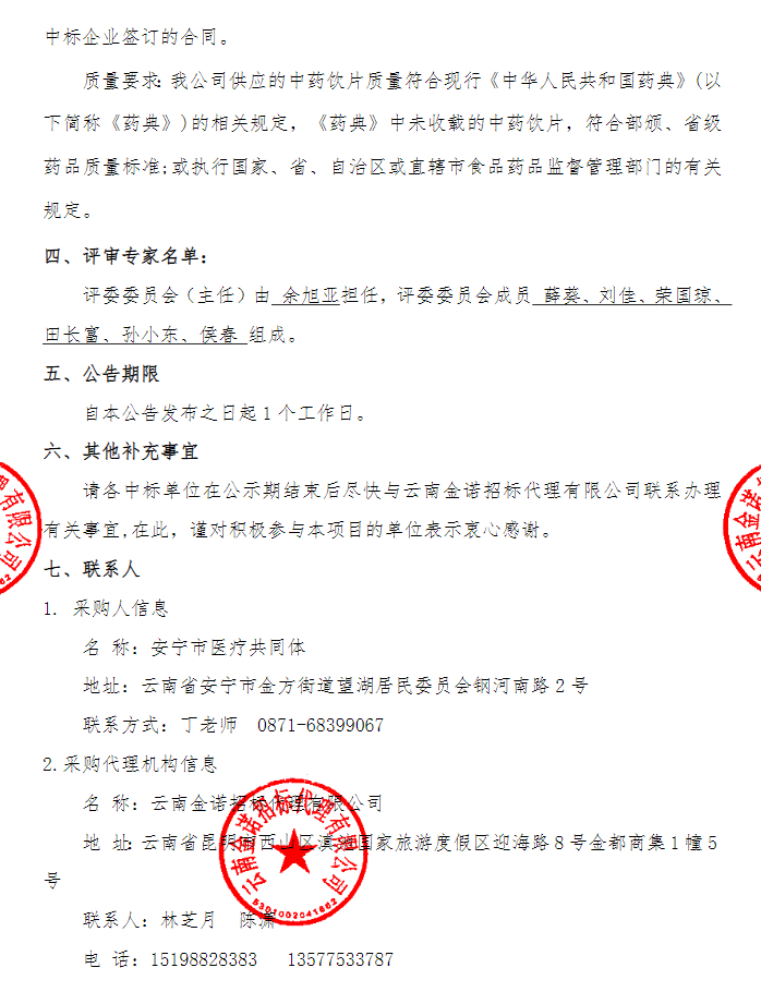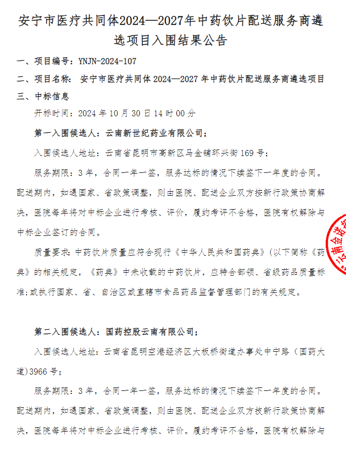 【昆明市安宁市医疗共同体】云南省昆明市安宁市医疗共同体2024—2027年中药饮片配送服务商遴选项目中标结果公告